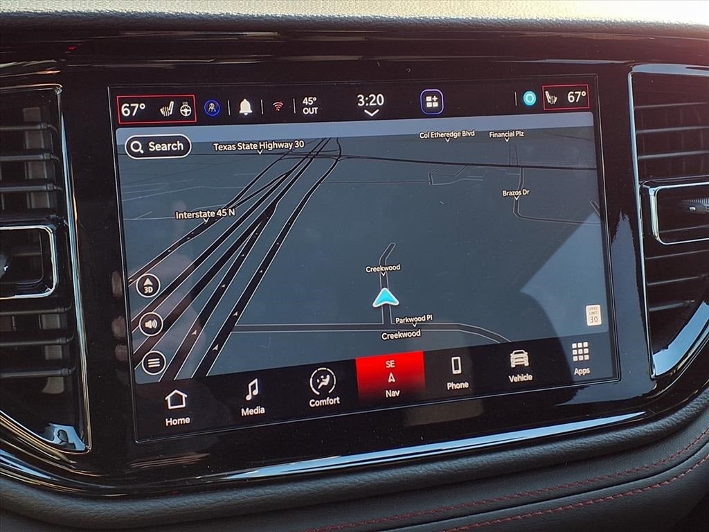 THIS VEHICLE COMES WITH THE FOLLOWING FEATURES AND OPTIONS : Blacktop Package (Black Roof Rails, Gloss Black Badges, Integrated Roof Rail Crossbars, and Satin Black Dodge Tail Lamp Badge), Quick Order Package 22S GT, 3.09 Rear Axle Ratio, 3rd row seats: split-bench, 4-Wheel Disc Brakes, 9 Speakers, ABS brakes, Air Conditioning, Alloy wheels, AM/FM radio: SiriusXM w/360L, Apple CarPlay/Android Auto, Auto-dimming Rear-View mirror, Auto-leveling suspension, Automatic temperature control, Brake assist, Bumpers: body-color, Cloth Bucket Seats with Shift Insert, Compass, Delay-off headlights, Driver door bin, Driver vanity mirror, Dual front impact airbags, Dual front side impact airbags, Electronic Stability Control, Emergency communication system: Dodge Connect, Exterior Mirrors with Heating Element, Four wheel independent suspension, Front anti-roll bar, Front Bucket Seats, Front Center Armrest w/Storage, Front dual zone A/C, Front License Plate Bracket, Front reading lights, Fully automatic headlights, Garage door transmitter, Gloss Black Exterior Mirrors, Heated door mirrors, Heated front seats, Heated steering wheel, Illuminated entry, Knee airbag, Leather steering wheel, Low tire pressure warning, Navigation System, Occupant sensing airbag, Outside temperature display, Overhead airbag, Overhead console, Panic alarm, ParkView Rear Back-Up Camera, Passenger door bin, Passenger vanity mirror, Power door mirrors, Power driver seat, Power Liftgate, Power steering, Power windows, Radio data system, Radio: Uconnect 5 Nav with 10.1 Display, Rain sensing wipers, Rear air conditioning, Rear anti-roll bar, Rear Load Leveling Suspension, Rear reading lights, Rear seat center armrest, Rear window defroster, Rear window wiper, Red Accent Stitching, Remote keyless entry, Security system, Speed control, Speed-sensing steering, Speed-Sensitive Wipers, Split folding rear seat, Spoiler, Sport steering wheel, Steering wheel mounted audio controls, Tachometer, Telescoping steering wheel, Tilt steering wheel, Traction control, Trip computer, Variably intermittent wipers, Voltmeter, Wheels: 20 x 8 Black Noise Split 5-Spoke, and Wheels: 20 x 8 Satin Carbon Split 5-Spoke.