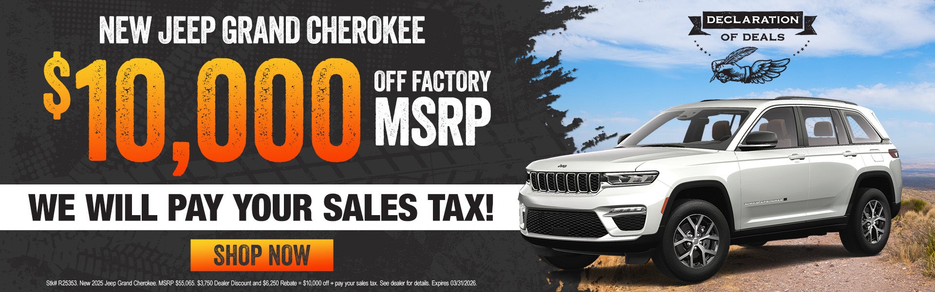 Stk# R25353. New 2025 Jeep Grand Cherokee. MSRP $55,065. $3,750 Dealer Discount and $6,250 Rebate = $10,000 off + pay your sales tax. See dealer for details. Expires 03/31/2026.