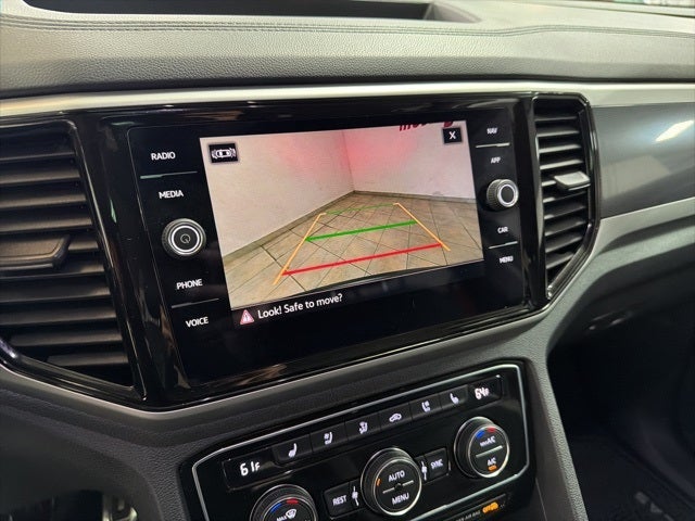 THIS VEHICLE IS EQUIPPED THE FOLLOWING FEATURES AND OPTIONS: Trailer Hitch Extras, VW Car-Net Safe & Secure 3-Year Package (DISC), 12 Speakers, 3.60 Axle Ratio, 3rd row seats: split-bench, 4-Wheel Disc Brakes, ABS brakes, Air Conditioning, Alloy wheels, AM/FM radio: SiriusXM with 360L, Auto High-beam Headlights, Auto-Dimming Rear-View Mirror, Auto-dimming Rear-View mirror, Automatic temperature control, Brake assist, Bumpers: body-color, Compass, Delay-off headlights, Driver door bin, Driver vanity mirror, Dual front impact airbags, Dual front side impact airbags, Electronic Stability Control, Emergency communication system: VW Car-Net Safe & Secure 5-year, Four wheel independent suspension, Front anti-roll bar, Front Bucket Seats, Front Center Armrest, Front dual zone A/C, Front fog lights, Front reading lights, Fully automatic headlights, Heated door mirrors, Heated front seats, Heated rear seats, Heated steering wheel, Heavy Duty Trunk Liner w/VW CarGo Blocks, Htd/Actively Ventilated Comfort Front Sport Seats, Illuminated entry, Leather Shift Knob, Low tire pressure warning, Luggage Net, Memory seat, Navigation System, Occupant sensing airbag, Outside temperature display, Overhead airbag, Overhead console, Panic alarm, Passenger door bin, Passenger vanity mirror, Perforated Vienna Leather Seating Surfaces, Power door mirrors, Power driver seat, Power Liftgate, Power moonroof: Panoramic, Power passenger seat, Power steering, Power windows, Radio data system, Radio: MIB3 Discover Media w/8 Touchscreen Nav, Rain sensing wipers, Rear air conditioning, Rear anti-roll bar, Rear audio controls, Rear reading lights, Rear seat center armrest, Rear window defroster, Rear window wiper, Remote keyless entry, Roadside Assistance Kit, Rubber Mats Kit - Bench Seats, Security system, Speed control, Speed-sensing steering, Split folding rear seat, Spoiler, Sport steering wheel, Standard Suspension, Steering wheel mounted audio controls, Tachometer, Telescoping steering wheel, Tilt steering wheel, Traction control, Trip computer, Turn signal indicator mirrors, Variably intermittent wipers, Ventilated front seats, Volkswagen Logo Puddle Lights, VW Care, and Wheels: 21 2-Tone Machined Alloy.